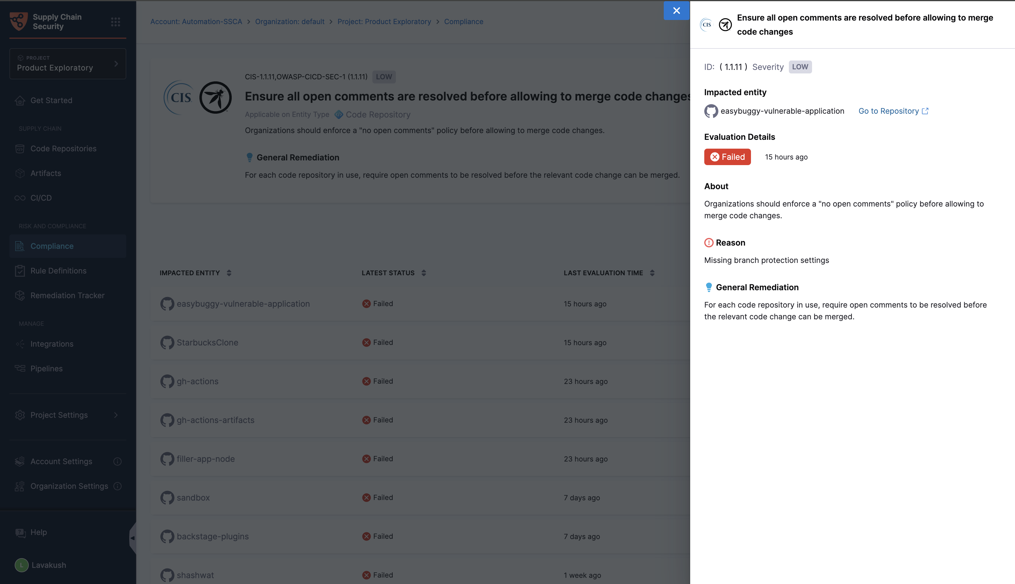 The Compliance section within the SCS module serves as a hub for assessing and understanding the risk posture of your entire supply chain. This section is indispensable for GRC (Governance, Risk, and Compliance) and security teams as it provides detailed evaluation results after applying all relevant rules to various target types within your supply chain. You can access a thorough summary of these evaluations, including the specific rules applied, their execution statuses, and the target types impacted by each rule.