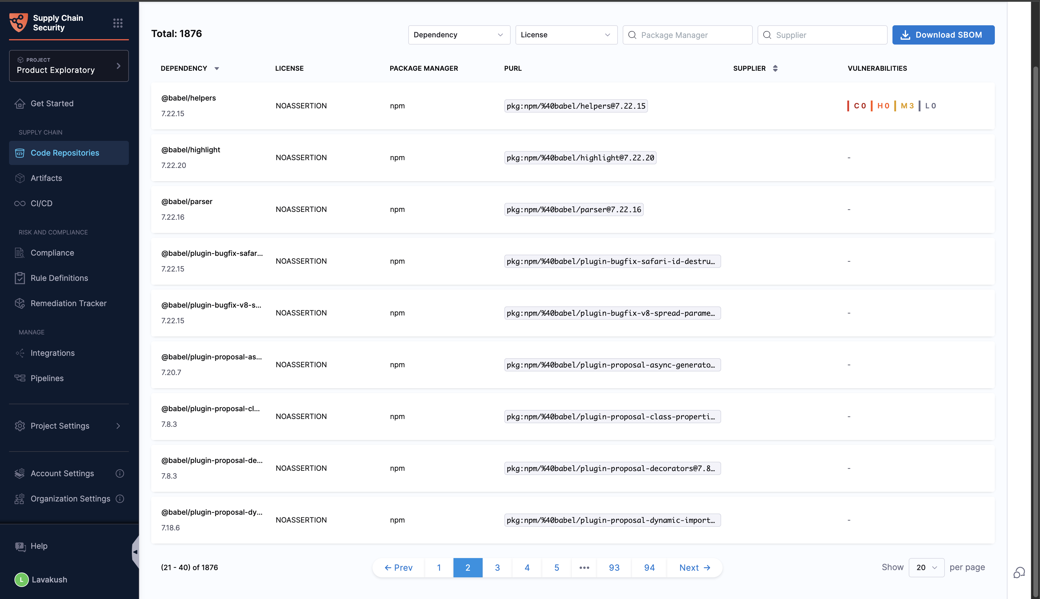 • Use the Download SBOM button available on the Code Repositories page.