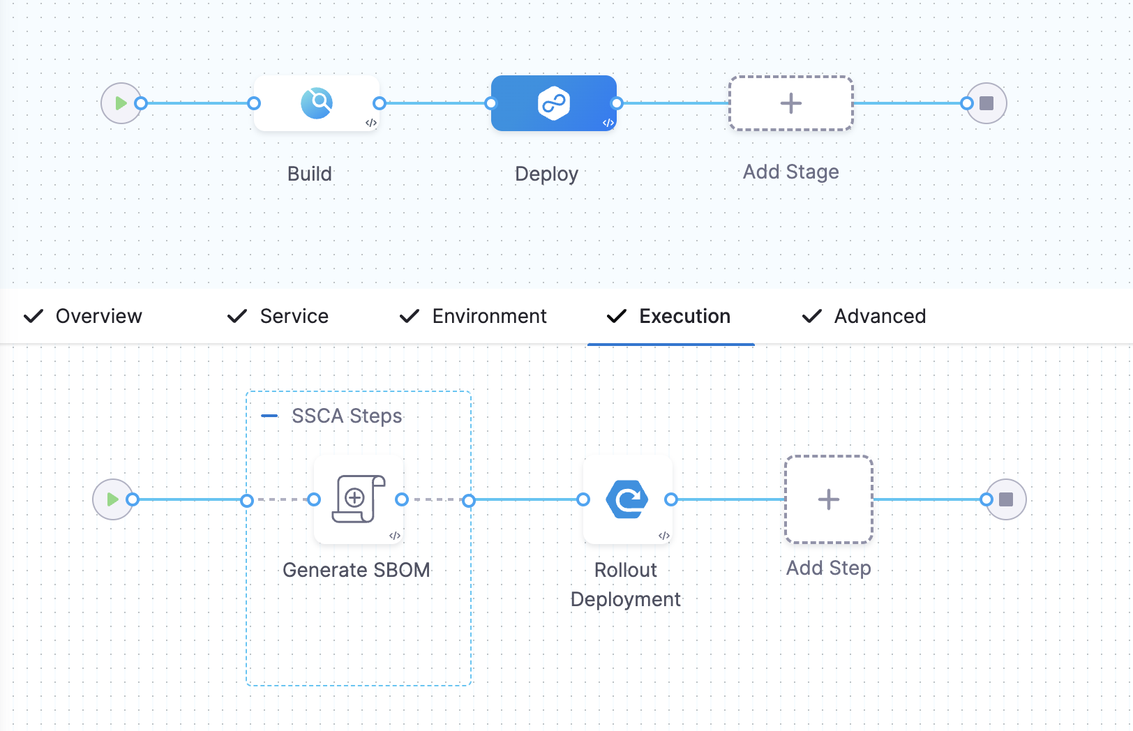 • In a Deploy stage, add the SBOM Orchestration step before the deployment step.