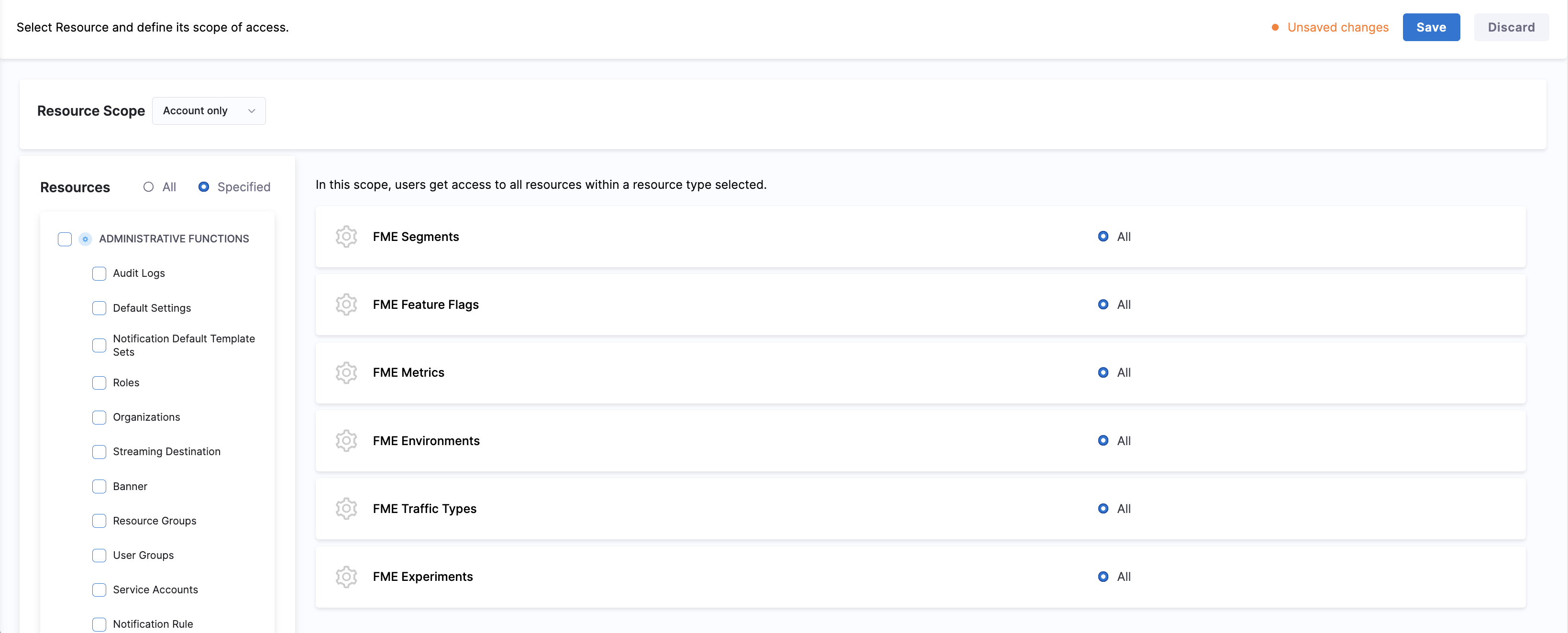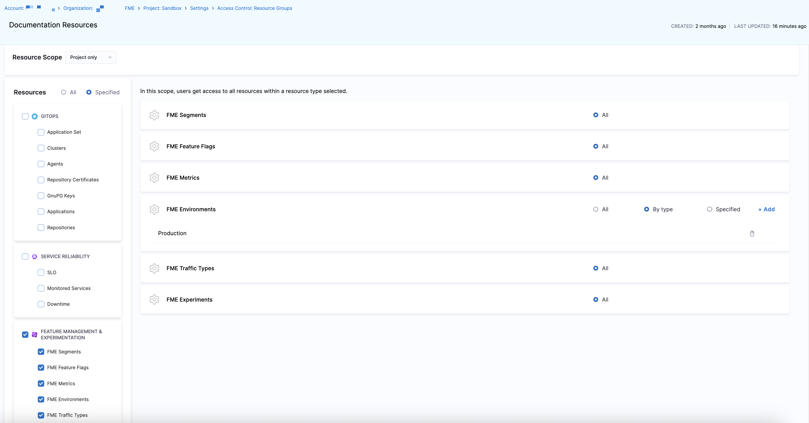 Harness FME now supports environment type-based access control in Harness resource groups, allowing administrators to grant permissions by FME environment type in addition to granting access to all FME environments or specific FME environments by name.