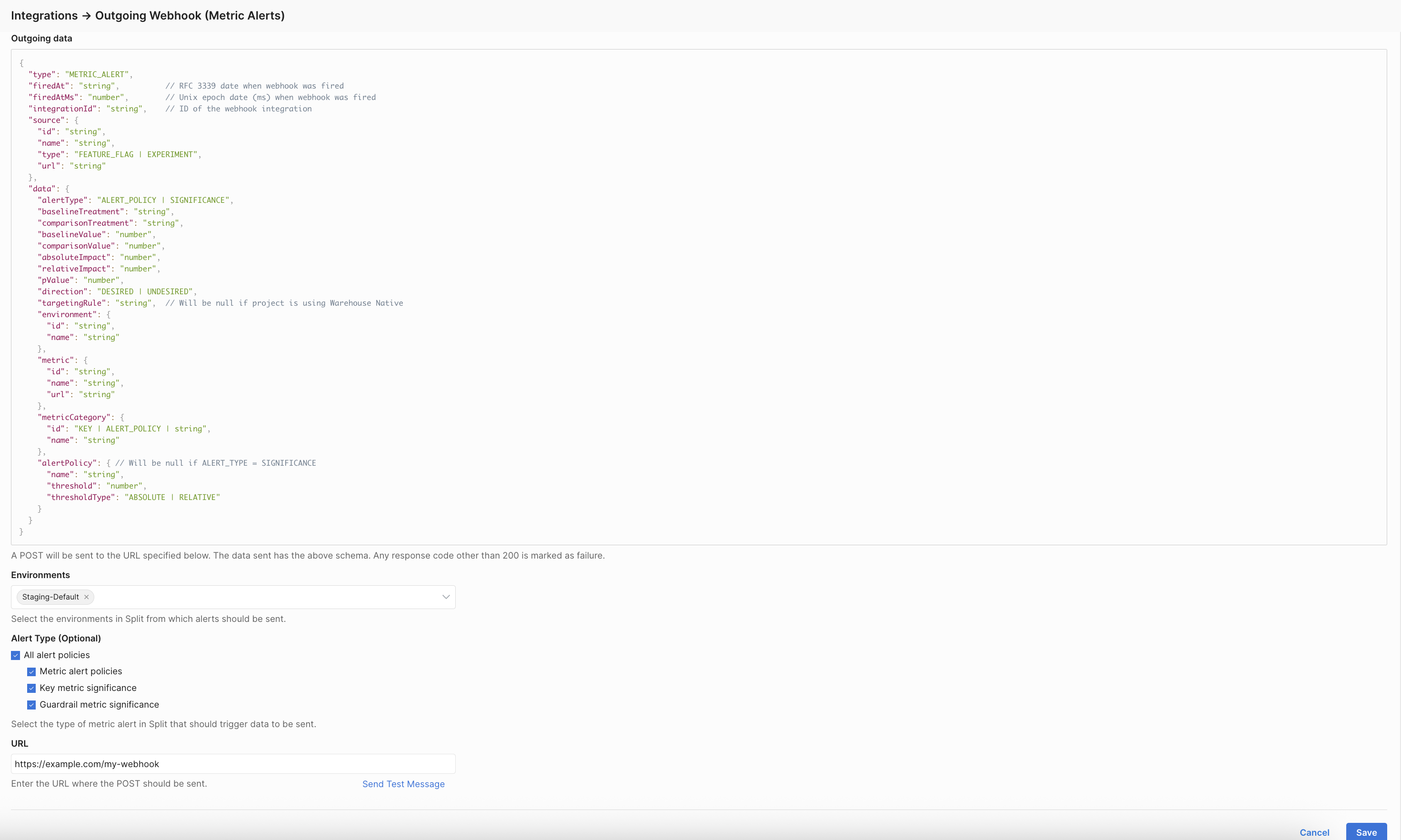The Metric Alert Webhook enables teams to automatically forward metric alert notifications (including alert policy degradations, key metric significance, and guardrail significance alerts) to any external system through a configurable HTTP POST webhook. This webhook supports experiment and feature flag alerts, enabling real-time automation and integration with your incident management, analytics, and CI/CD tools.