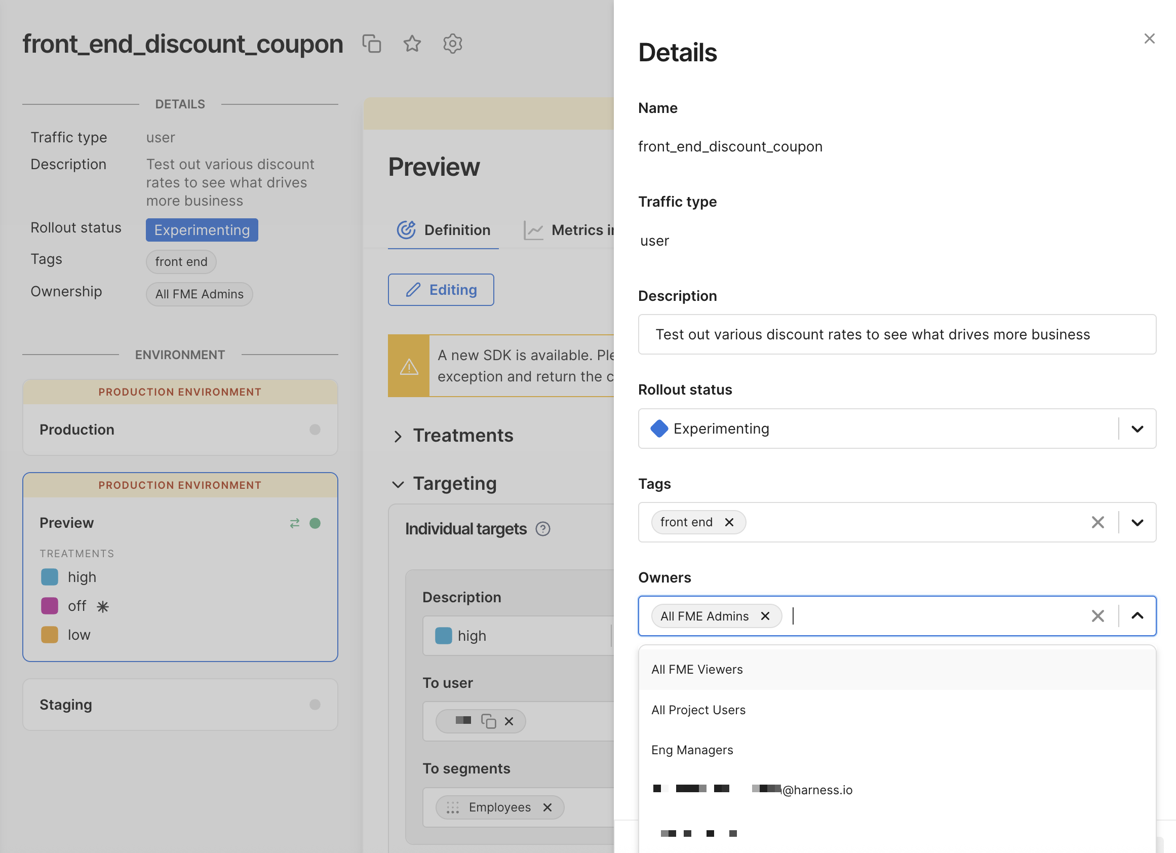 Harness FME now provides a streamlined way for administrators to manage the transition from Split legacy permissions to centralized RBAC governance. Migrated customers can now choose how Split legacy environment-level and object-level permissions interact with Harness RBAC on the Permissions Enforcement page in FME Settings.