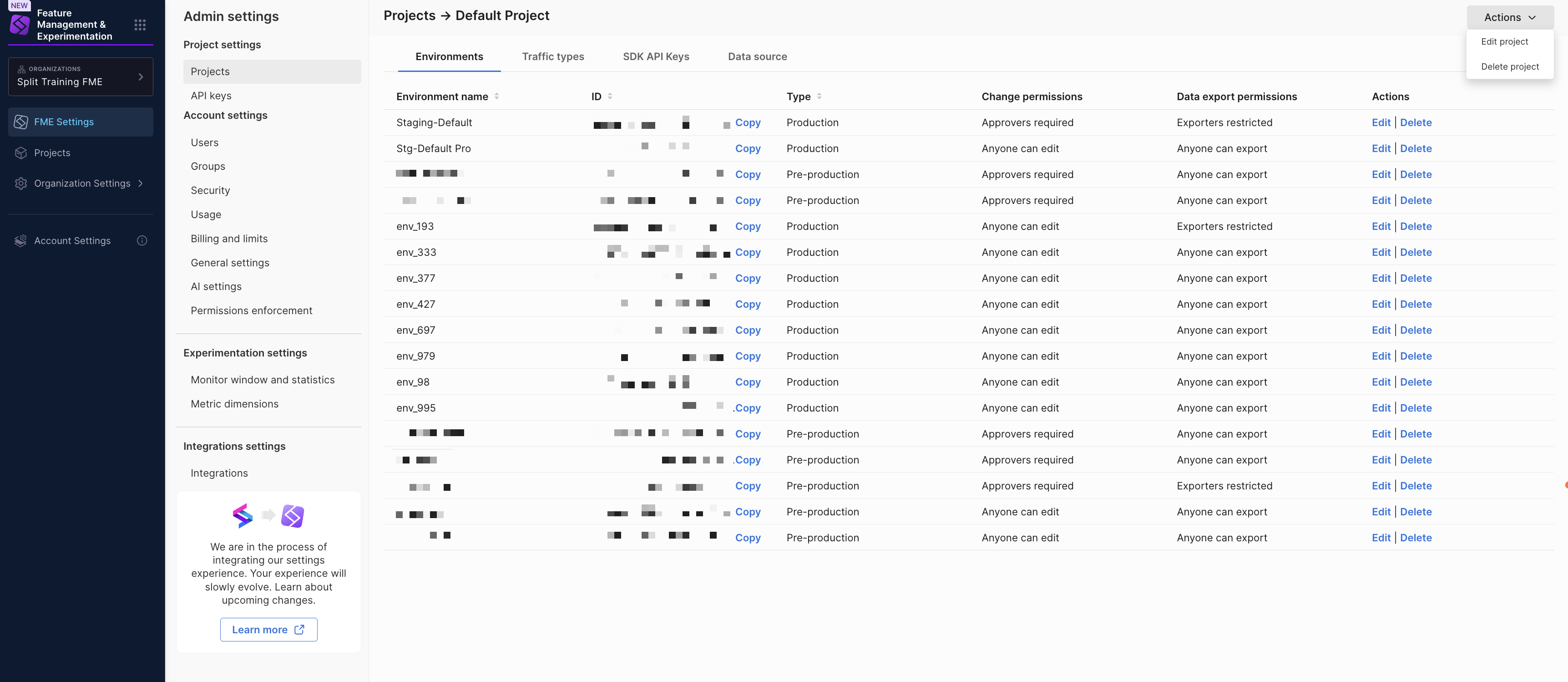 Harness FME has improved project configuration by moving Create Environment, Create Traffic Type, and Create SDK API Key buttons out of the Actions dropdown menu into their respective tabs on the Projects page in FME Settings.