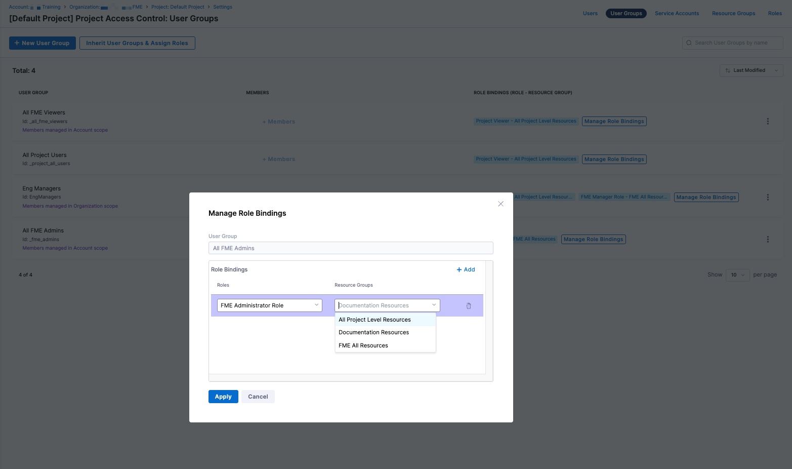 Once you've configured a resource group, you can assign that resource group to a role by clicking Manage Role Bindings on the Users or User Groups page.